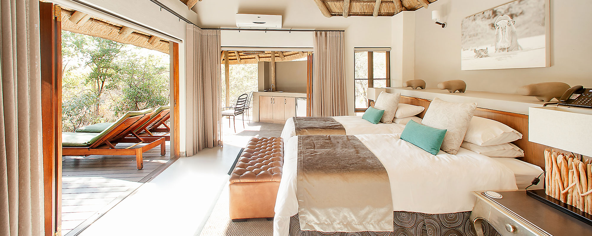Tambuti Lodge consists of five luxury chalets all fitted with contemporary elegance and quality furnishings. Surrounded by striking Tambuti Trees, all suites offer spectacular bush views and are equipped with air-conditioning, an en-suite bathroom, double vanities, bath, indoor and outdoorshowers, completed by a private deck.