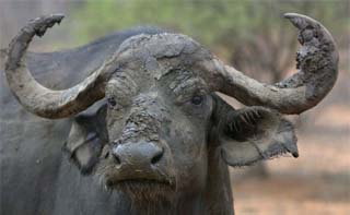 The horns form a solid plate on the top of the buffalo’s head and its large and heavy upper body makes it an impressive sight. Male buffalos reach a shoulder height of 1.6 metres and can weigh up to 900 kg. The horns of a male are about a metre wide, while the females are smaller in size with smaller horns.